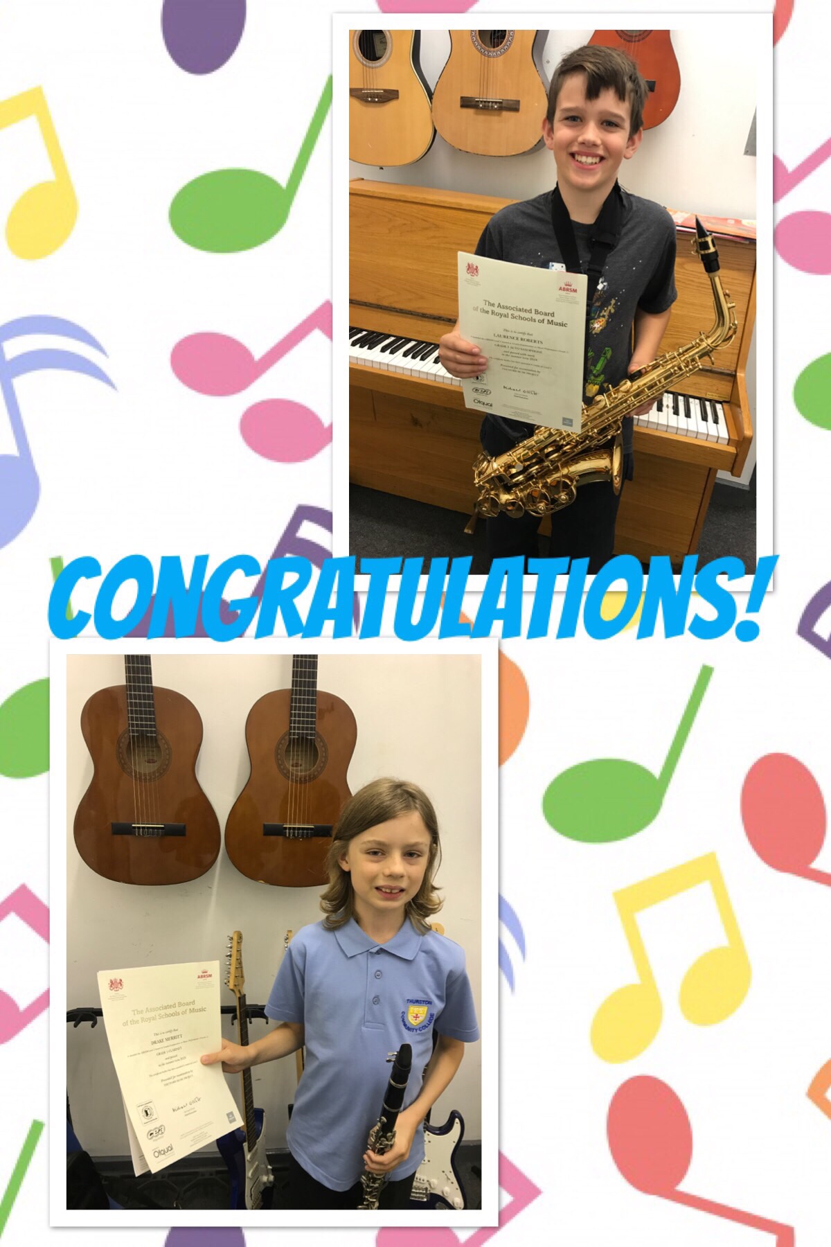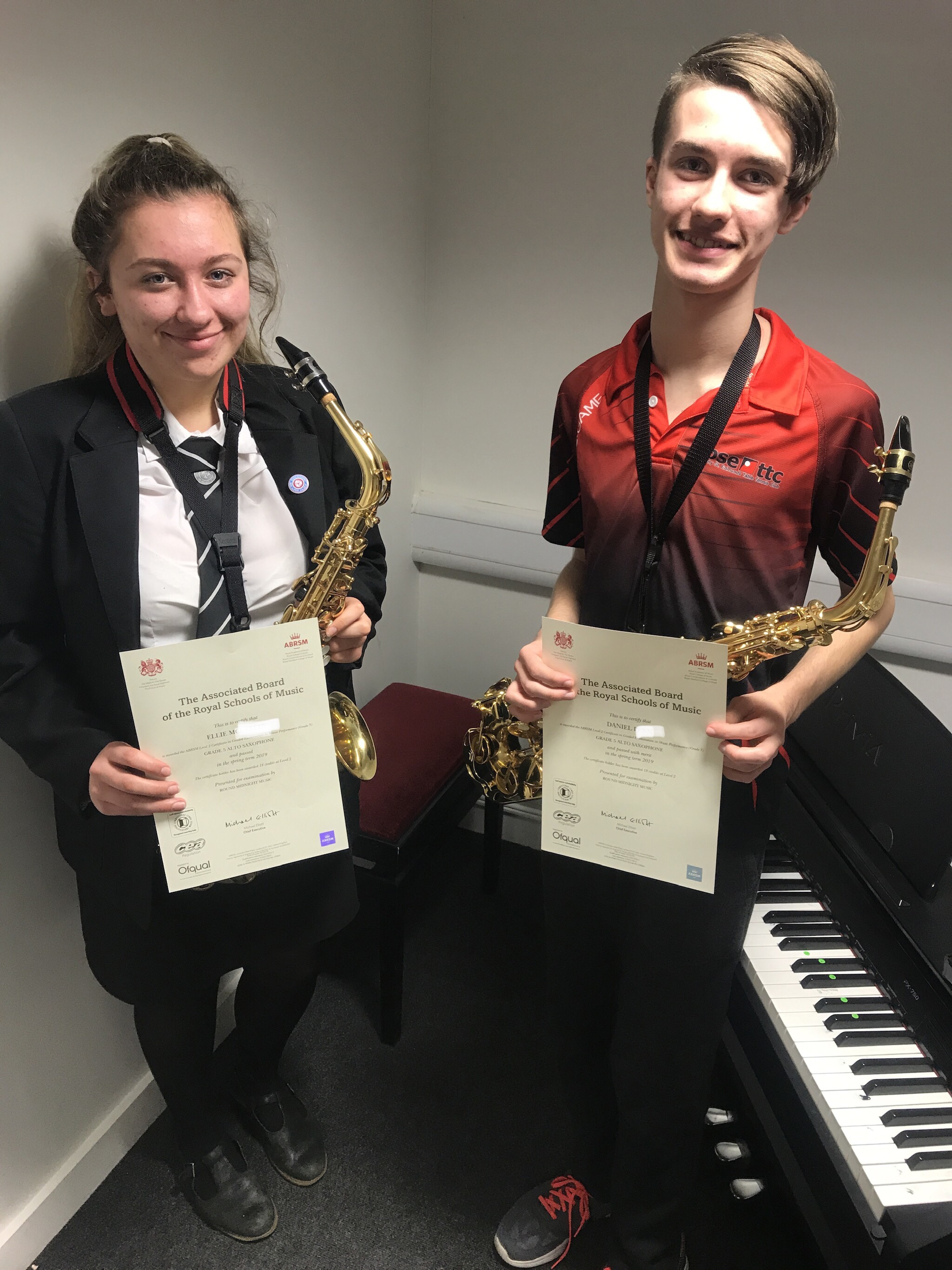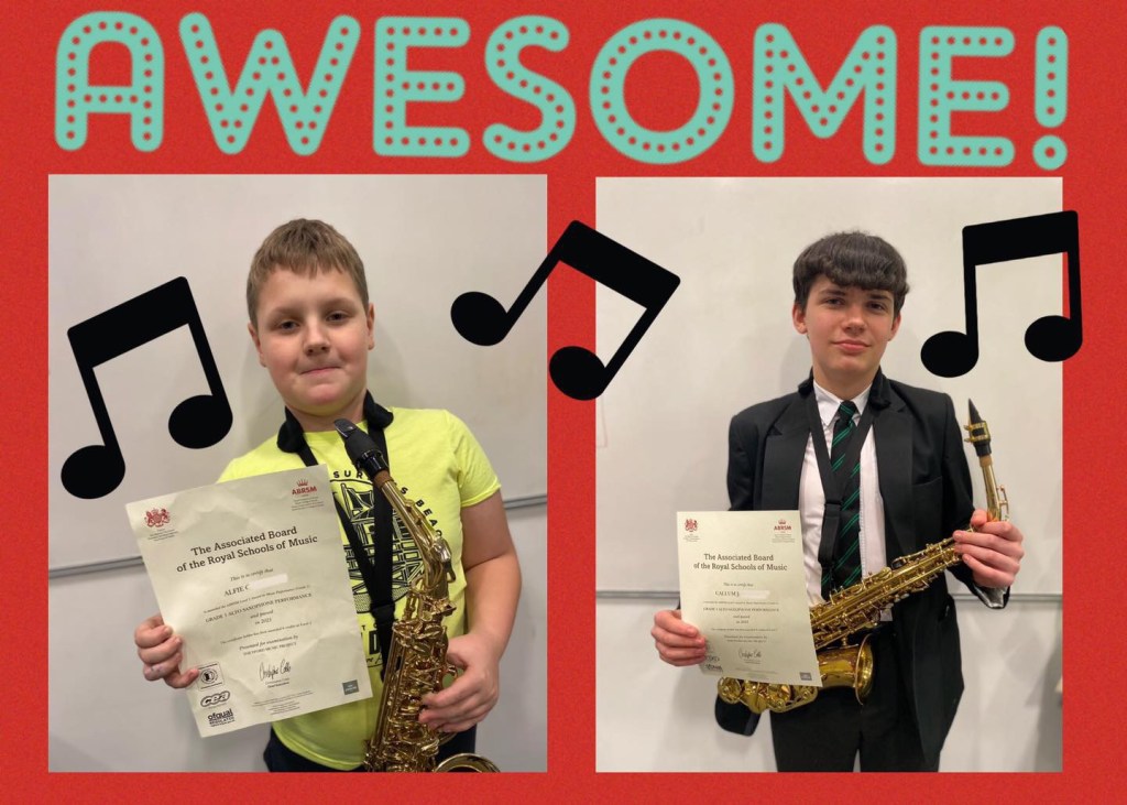 Well done to Laurence who passed his grade 3 saxophone performance exam and Ellie who passed her Grade 5 piano exam.