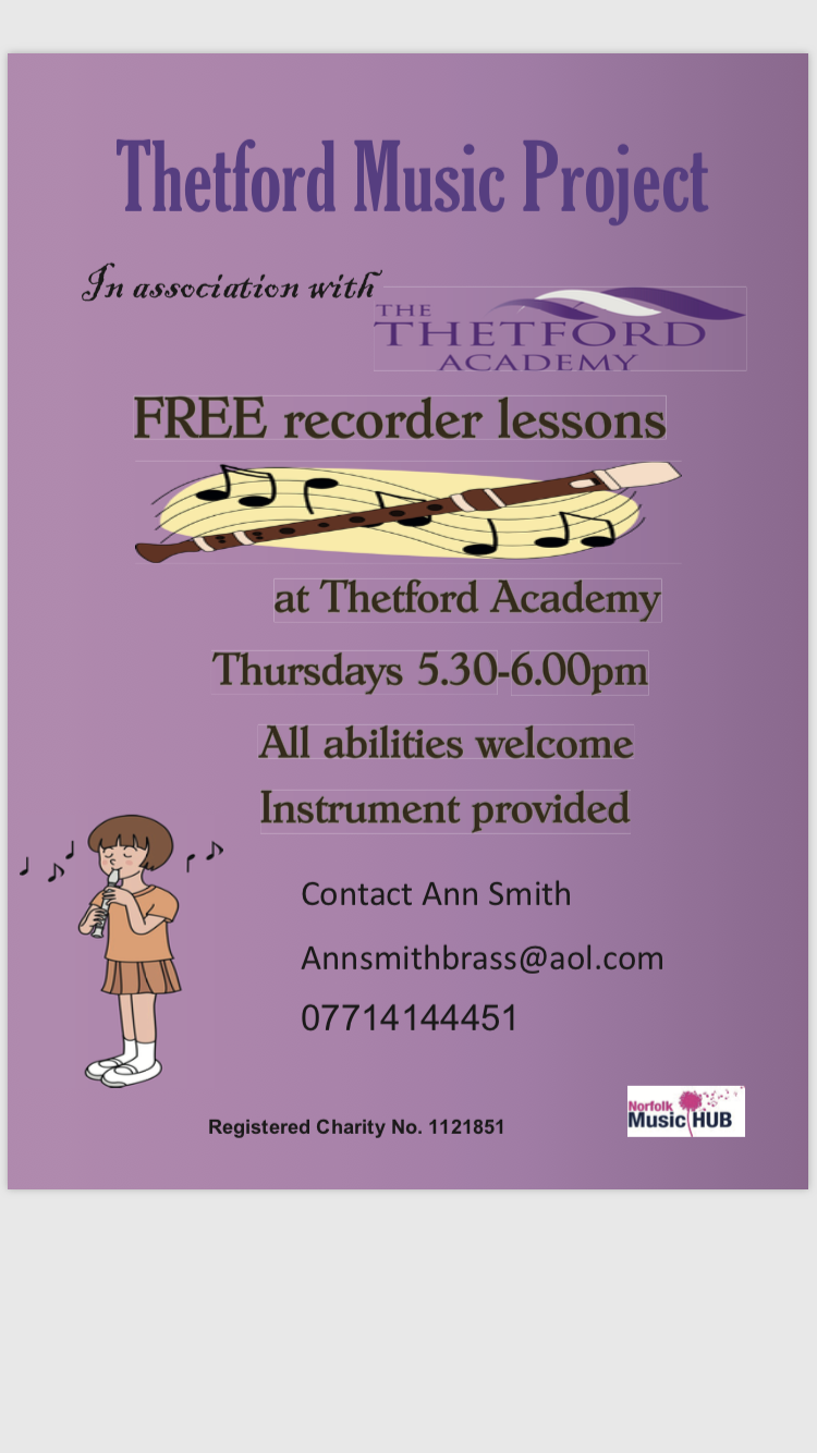 We will not be starting TMP lessons until Monday 17th January 2022 ( instead of 10th January).The Thetford Academy are having some building work done in the Music Blocks, so they will not be available for TMP to use . The work is planned to be completed by February half term and will be a big improvement.In the meantime TMP are going to work with Thetford Academy to find some temporary rooms and to sort out equipment required etc. We plan to have this sorted in time for the postponed start of 17th January .We apologise for any inconvenience caused.